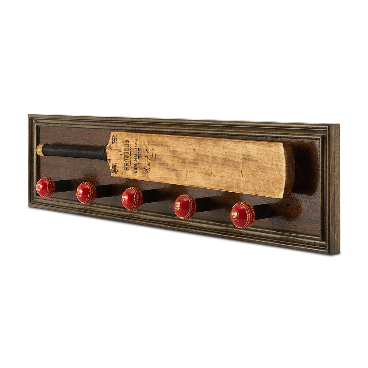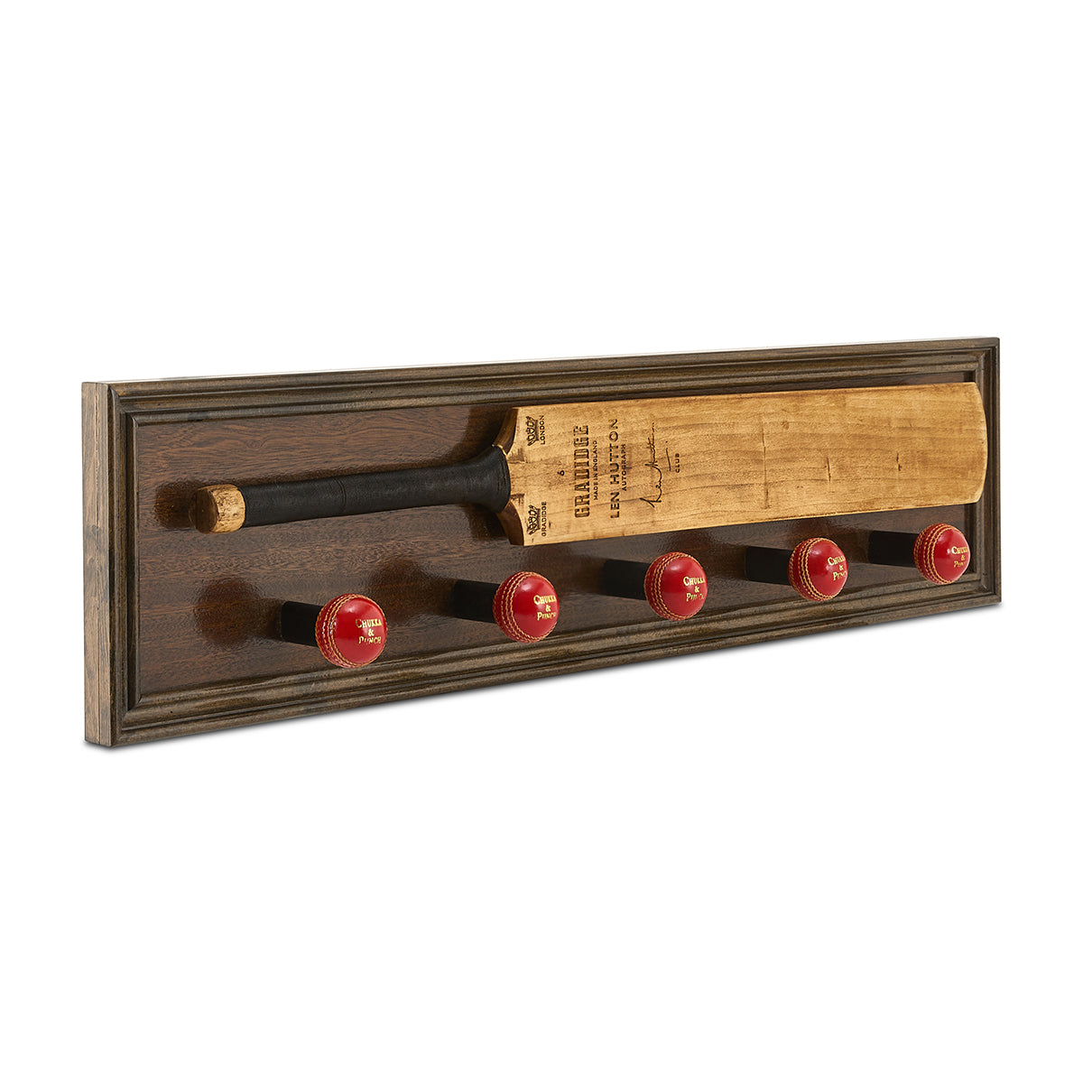 Each hanger features a meticulously finished replica of the iconic Len Hutton cricket bat, mounted on a rich, dark wood panel that exudes timeless sophistication. The bat is complemented by five handcrafted coat pegs, fashioned from genuine cricket balls — a thoughtful detail that adds both charm and authenticity.